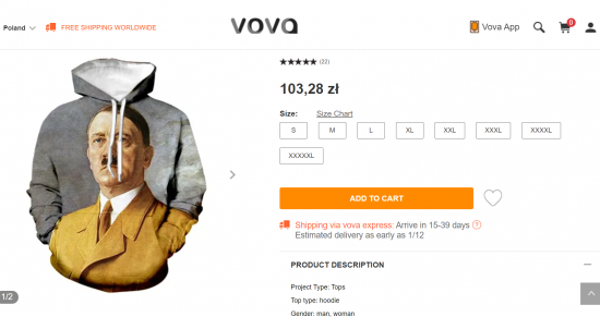 Na populárnom internetovom obchode „Vova“ sa objavili mikiny s kapucňou a veľkým obrázkom vojnového zločinca Adolfa Hitlera. Centrum Simona Wiesenthala už zaslalo vedeniu obchodu list, v ktorom požaduje zničenie existujúcich zásob tohto oblečenia a ospravedlnenie židovskej komunite.
